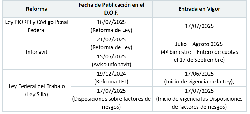 A manera de resumen presentamos las reformas comentadas, su fecha de publicación den el DOF, así como su entrada en vigor.